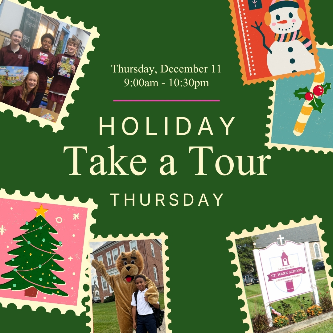 Join us at our next Take a Tour Thursday! Come stop by for a tour led by our student ambassadors. See the classes in action, meet the teachers and staff, and learn about everything St. Mark has to offer!